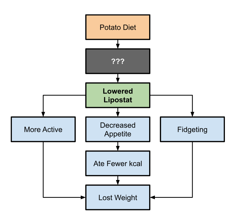 On monotony/food reward— I still find this way more plausible than other explanations mentioned. My guess is that any monotonous thing would work in theory, but that potato is an unusually good candidate given it is near nutritionally-complete and has lots of satiating fibre (if it __does__ have some special weight loss attribute, it might be worth looking into ‘resistant starch’ which apparently can lower blood sugar).