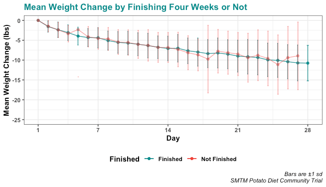 One participant (40207077) didn’t report his weight for day 28, so we used his day 29 data. Coincidentally this is also the person who lost the least weight over the 4 weeks. If you kicked him out because he often forgot to report his weight, average weight lost on the diet would be even greater.